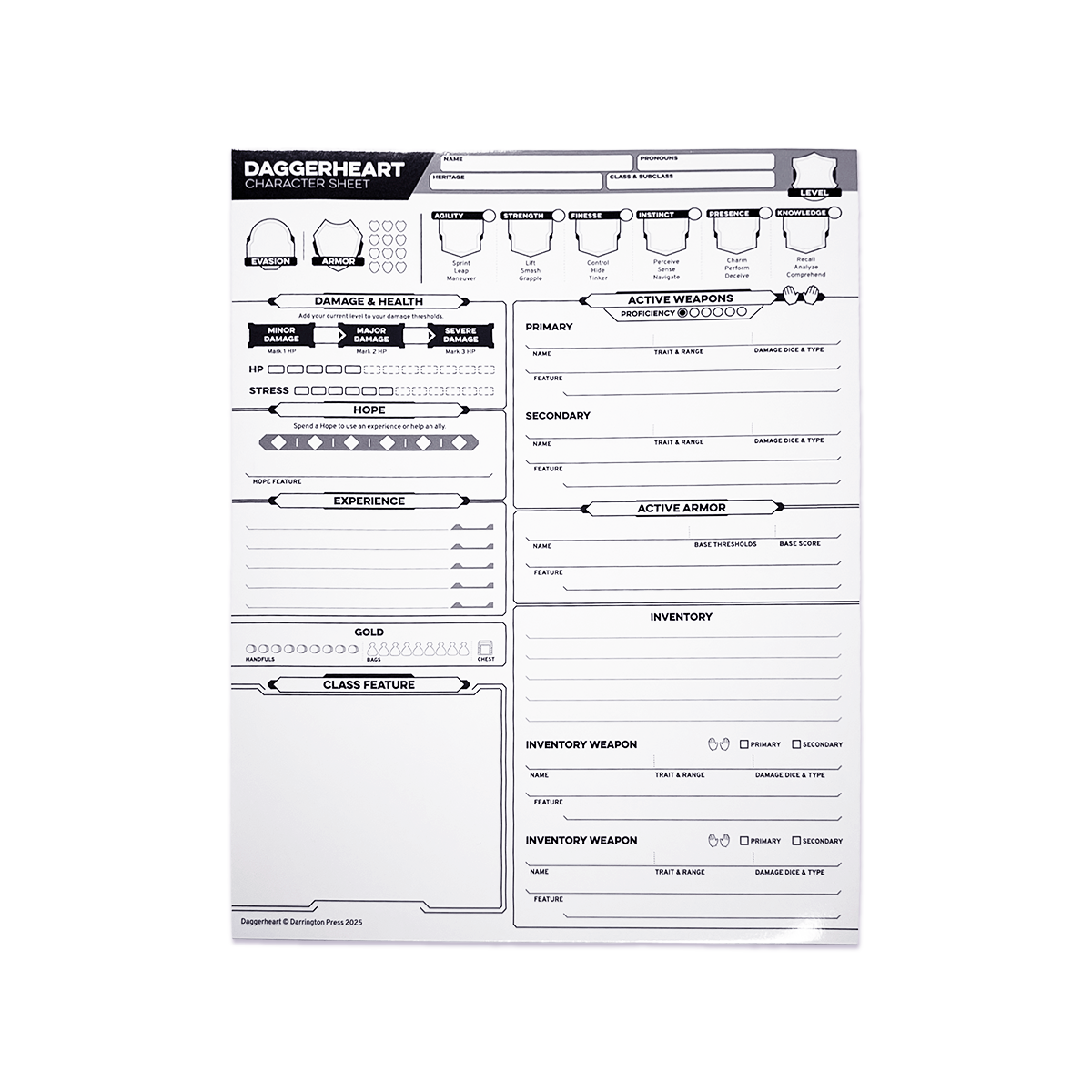 - Includes a dry/wet erase Daggerheart character sheet for fast and easy tracking (marker not included).