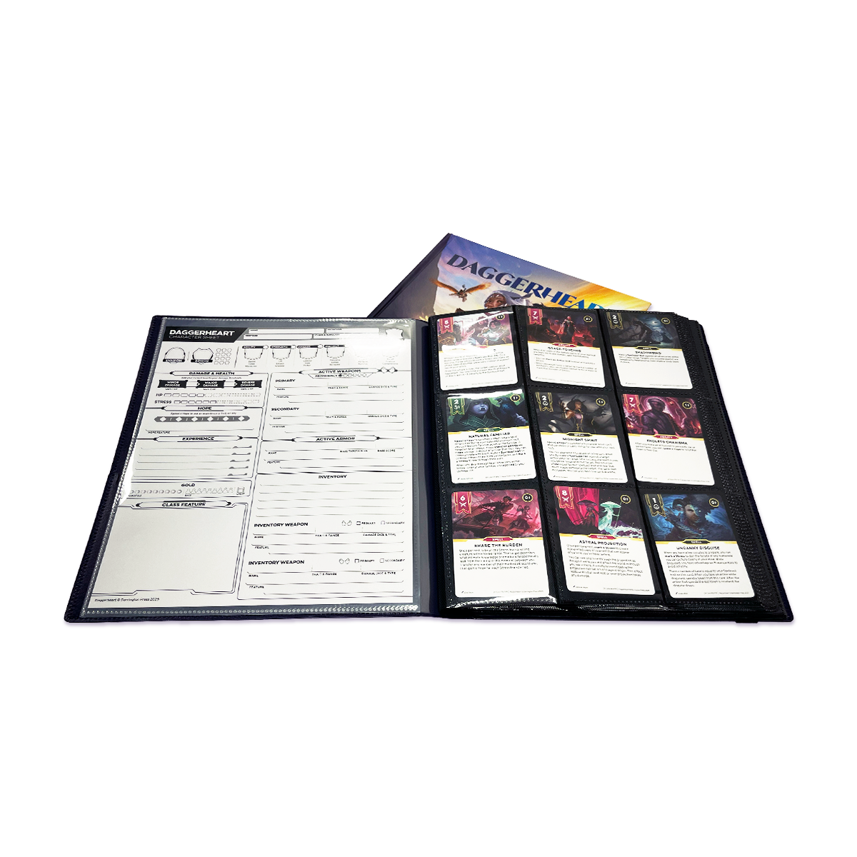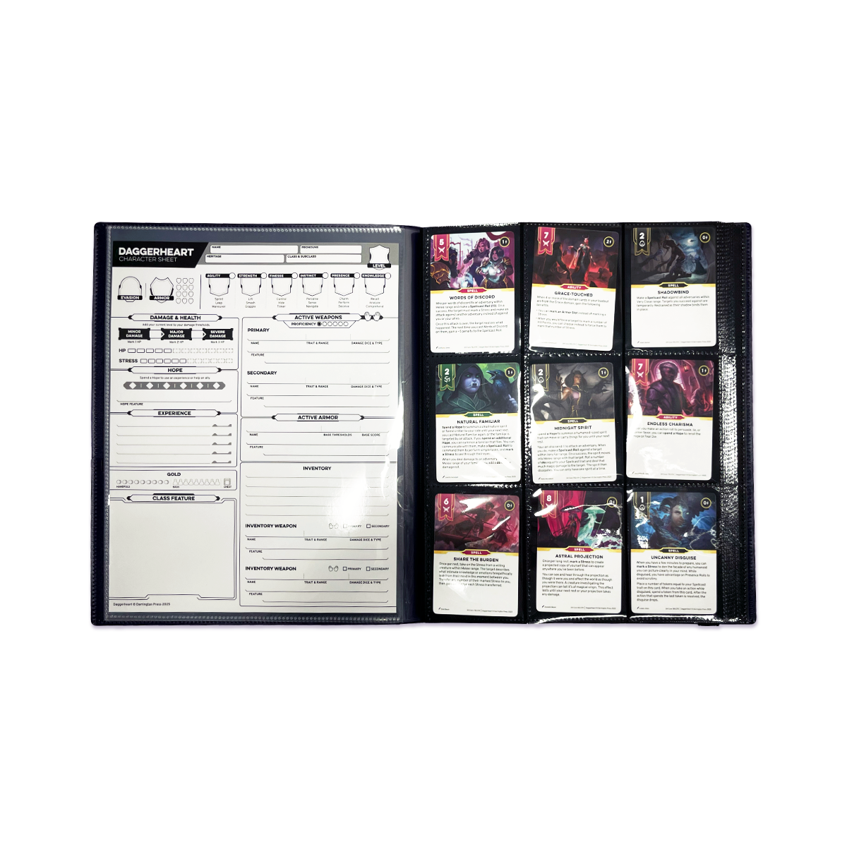 Whether you're diving into an epic battle or spawning new tales of hope and heroism, the Daggerheart Folio keeps your story safe—one card at a time with room for every card in the Daggerheart Core Set and more, sleeves for 6 full-page (8.5" x 11") sheets for your character sheets or notes, plus additional inside cover pockets. And to make tracking easier, there is a dry erase character sheet included. Made for players and GMs alike, this folio was carefully designed to protect and organize character and gameplay cards for the true adventurer wanting to carry their Daggerheart cards, sheets, and notes in style. It’s gorgeously illustrated with the Daggerheart domain wheel on the front cover, and the official Daggerheart logo on the back.