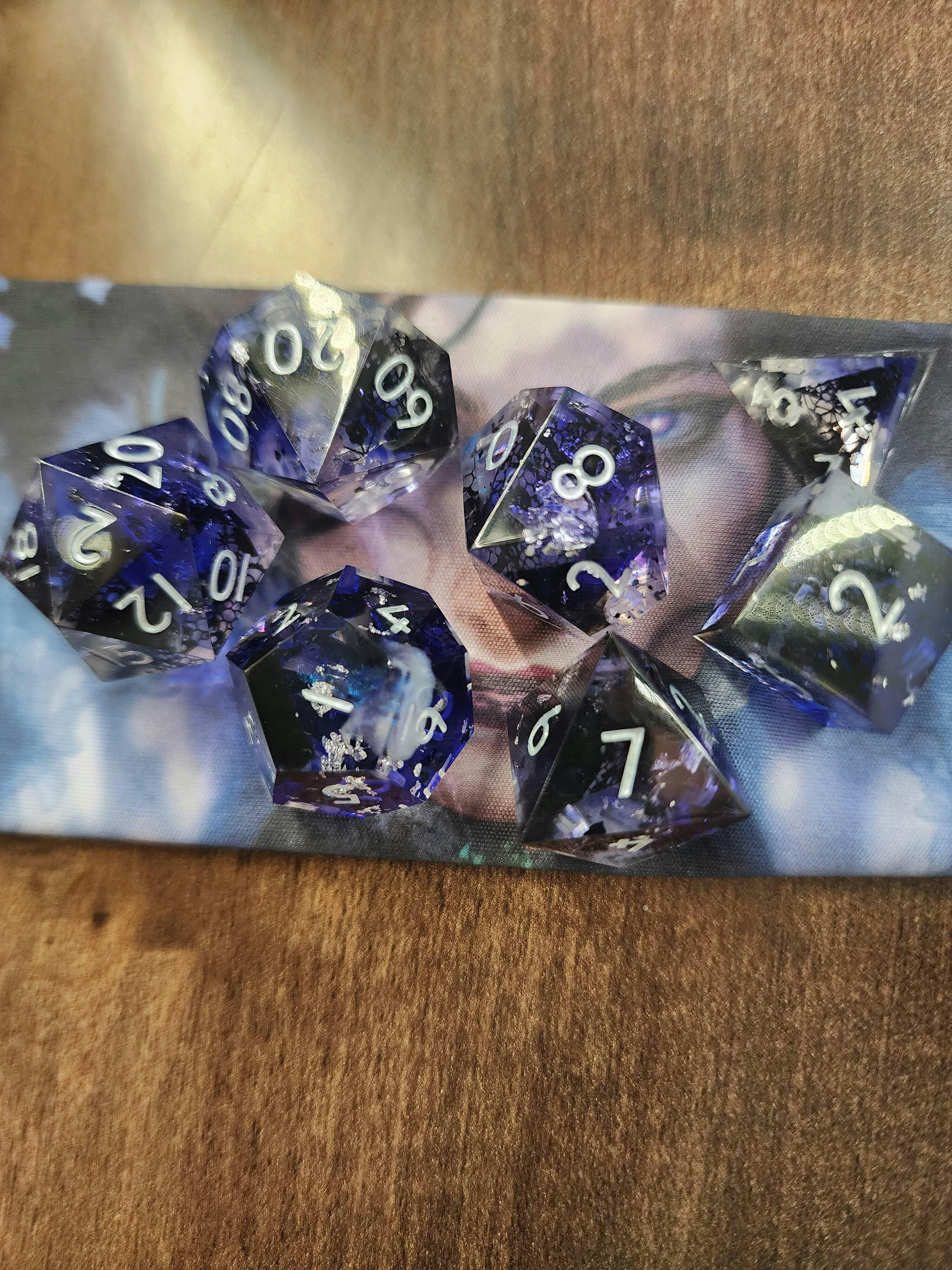 The dice feature a light grey and white base with a custom, hand-mixed “Delilah Purple” gradient. Cuts of dark lace float through the pearlescent purple mica shimmer and silver foil flakes evoking her darkly intricate power.