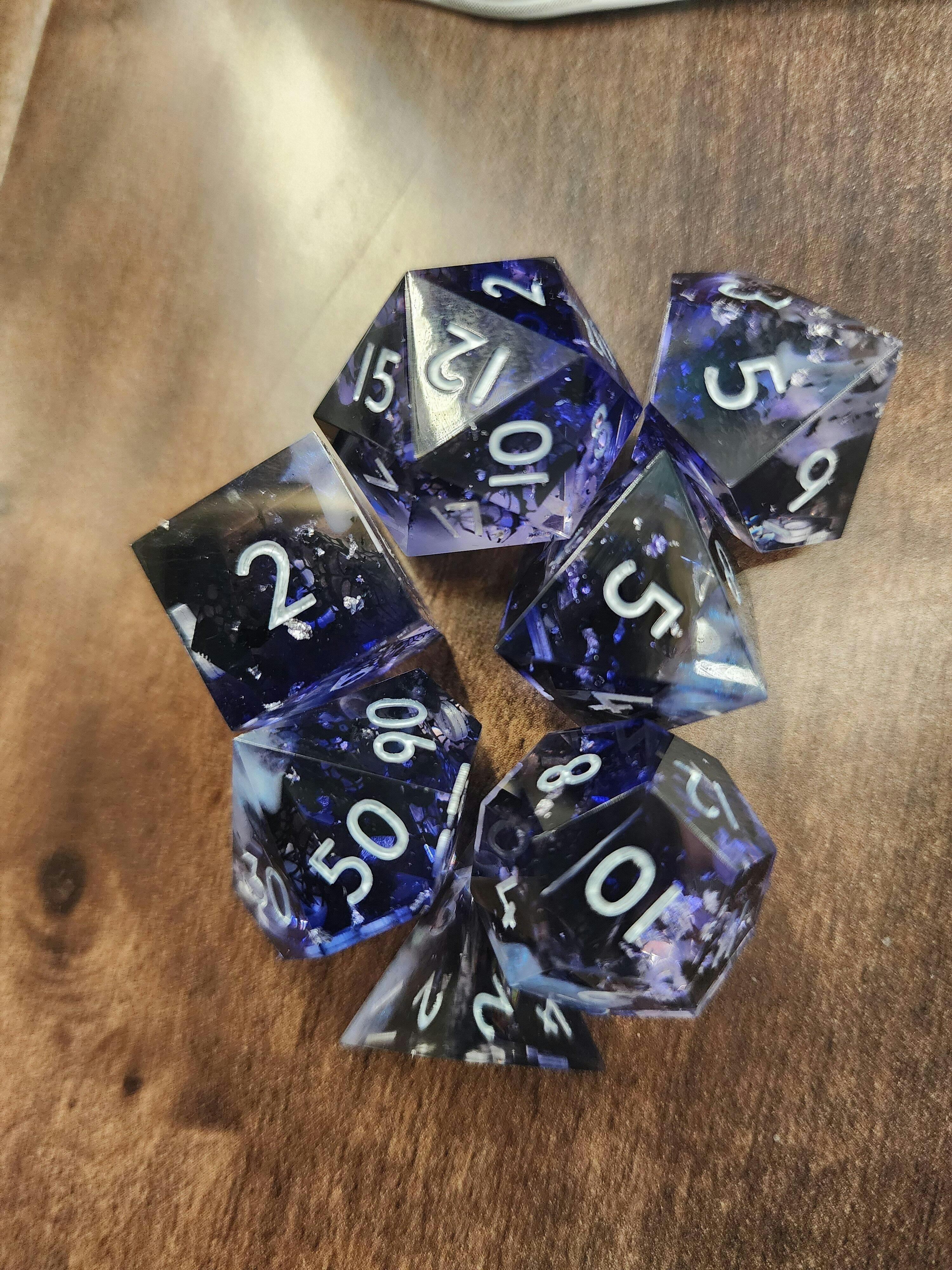 Set of 7 sharp edged, crystal-shaped dice including one of each of the following dice styles:
