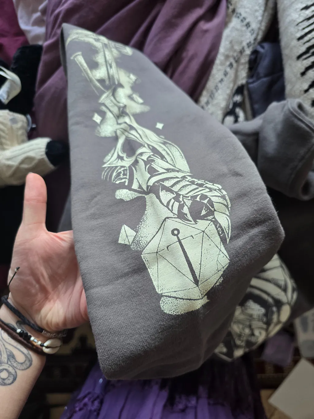 The sleeves carry the rest of the party with you on your journey with their weapons etched like relics along the fabric. Azune’s war pick, the Liar’s Blade of Thjazi and Halandil, and Sir Julien’s gauntlet line one arm. The other arm bears Wiccander’s staff, Tyranny’s dagger, and Vaelus’ censer—instruments of magic, credence, and silent strength.