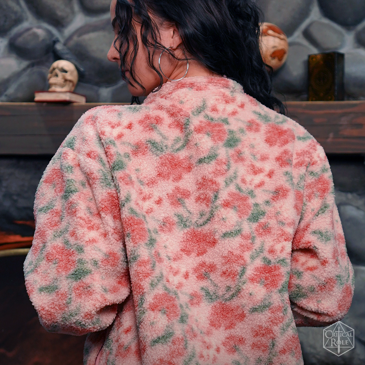 Wrap yourself in whimsical warmth (and maybe a little mischief) with this super soft fleece zip-up jacket. Soft as a cupcake’s frosting, this jacket features a pink and green floral print, with a contrasting front left chest pocket, subtly detailed with an embroidered bee icon and custom Critical Role logo zipper pull. The side zip-up pockets are soft and roomy to keep your hands, dice, or snacks warm and secure. It’s perfect for snuggling up during your next campaign binge—or plotting harmless pranks on your Critter friends.