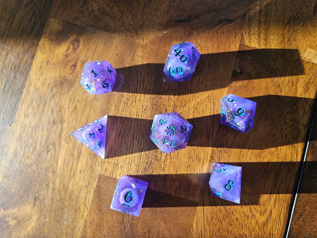 - d4, d6, d8, d10, d12, d20, and percentile dice